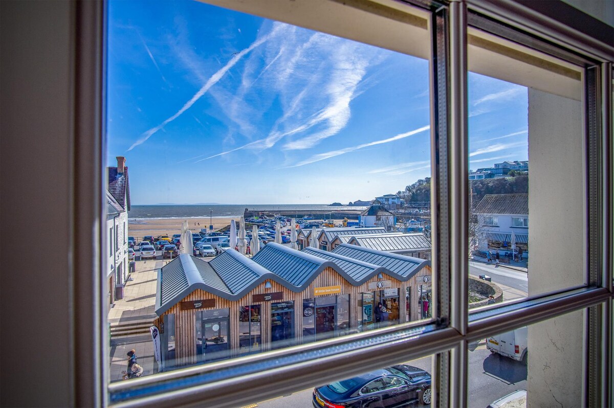 En el corazón del pueblo, este apartamento de 4* en el primer piso tiene impresionantes vistas al mar sobre la playa de Saundersfoot. Directamente en el camino costero de Pembrokeshire perfecto para familias, nadadores marinos, caminantes. Muchas actividades junto al mar y atracciones de ocio cercanas. A 10 minutos en coche de Tenby. Supermercados, tiendas, cafeterías y restaurantes en el pueblo. Buenas rutas de autobús. Estacionamiento de camino costero con permiso de estacionamiento incluido con puntos de carga rápidos para vehículos eléctricos a 5 minutos a pie del piso. (Nota: no hay acceso directo a la playa a través del jardín)