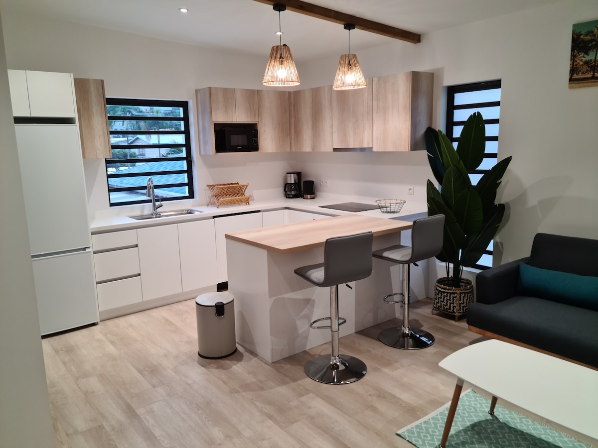 Venga a relajarse y recargar energías en este bonito estudio independiente de 24 m² junto al mar. Dispondrá de una habitación de 12 m² con aire acondicionado y armario, una habitación de 12 m² con baño inodoro y muebles de cocina, así como una pequeña terraza privada frente a la laguna para comer o relajarse. Acceso a una playa privada ideal para nadar y utilizar libremente 2 kayaks para explorar los islotes. También disponibles: máscaras, tubos y toallas de playa para el snorkling.