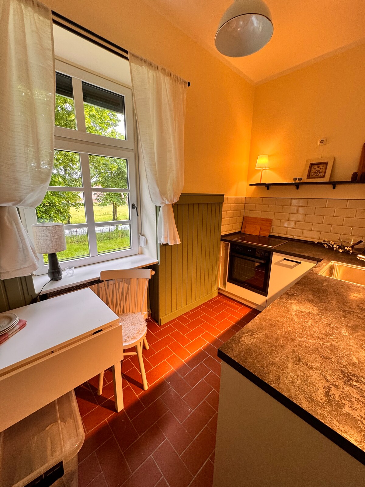 El apartamento Köster está ubicado en la planta baja de la histórica casa de campo que probablemente perteneció a la finca Lammershagen: 80 m² – equipado con una acogedora cocina-sala de estar, estufa a leña, piano (ligeramente desafinado) y una terraza privada. El romántico y comunitario jardín ofrece mucho espacio para relajarse. Wifi (fibra óptica 200 mbts), ropa de cama, toallas incl. Selenter See a 15 minutos. A 5 minutos a pie del pueblo, A 17 km del Mar Báltico