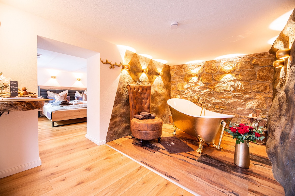 ¡Simplemente estar! El idílico pueblo de Vorra da la impresión de que el tiempo se ha detenido. Junto a la reserva natural se encuentra nuestro Romantik Chalet, que os invita a pasar unos días de relax en pareja. Con una vista maravillosa, se puede mirar sobre el valle de Pegnitz y dejar que el alma se balancee. Disfrutad de la bañera de hidromasaje con cascada, del calor de las sillas de infrarrojos de pino cembro o simplemente relajaos en la terraza cubierta y escuchad el murmullo de la fuente.