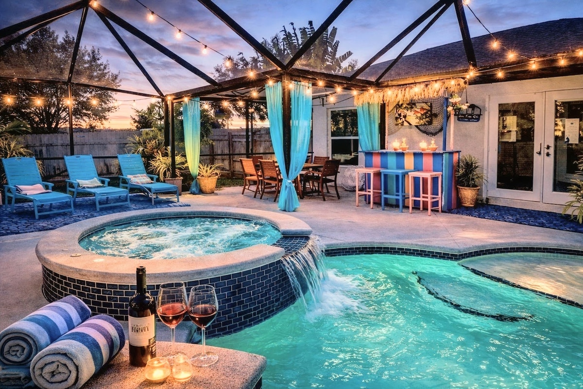 Romance Beach Resort te trae la playa. Esta es una casa con piscina de 3 dormitorios, un pequeño cuarto de bebé y 2 baños. La piscina está climatizada y rodeada por una zona de playa de arena. El patio está completamente vallado y es privado por todos los lados. El patio tiene una terraza de 16x16 con tumbonas, toallas, flotadores y sillas de playa. También hay un columpio para adultos, un juego de «cornhole» y una cascada. Esta casa es una escapada perfecta. Un gran lugar para familias con niños. También se proporcionan juguetes, wii y suministros de playa.
