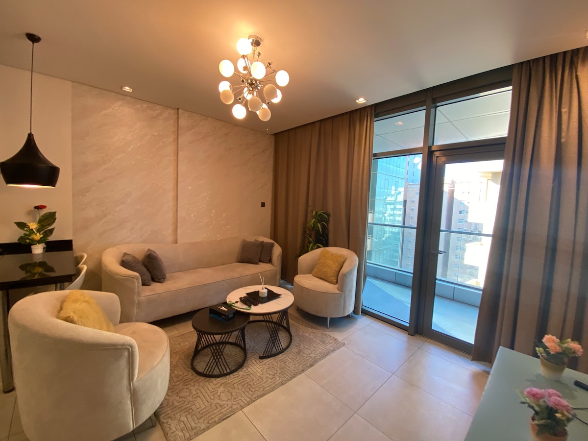 Características del departamento: • Amplio diseño de 96 metros cuadrados con decoración contemporánea • Amplio balcón privado con vistas panorámicas. • Cocina con electrodomésticos de alta gama • Acogedor dormitorio con una lujosa cama tamaño king y amplio espacio de almacenamiento. • Baño moderno con accesorios premium Edificio y servicios: • Gimnasio y piscina de última generación • Seguridad y servicio de conserjería las 24 horas, los 7 días • Espacio de estacionamiento dedicado • Restaurantes, cafeterías y tiendas minoristas en el lugar El centro de la ciudad, el centro comercial Seef, las avenidas a 5 minutos.