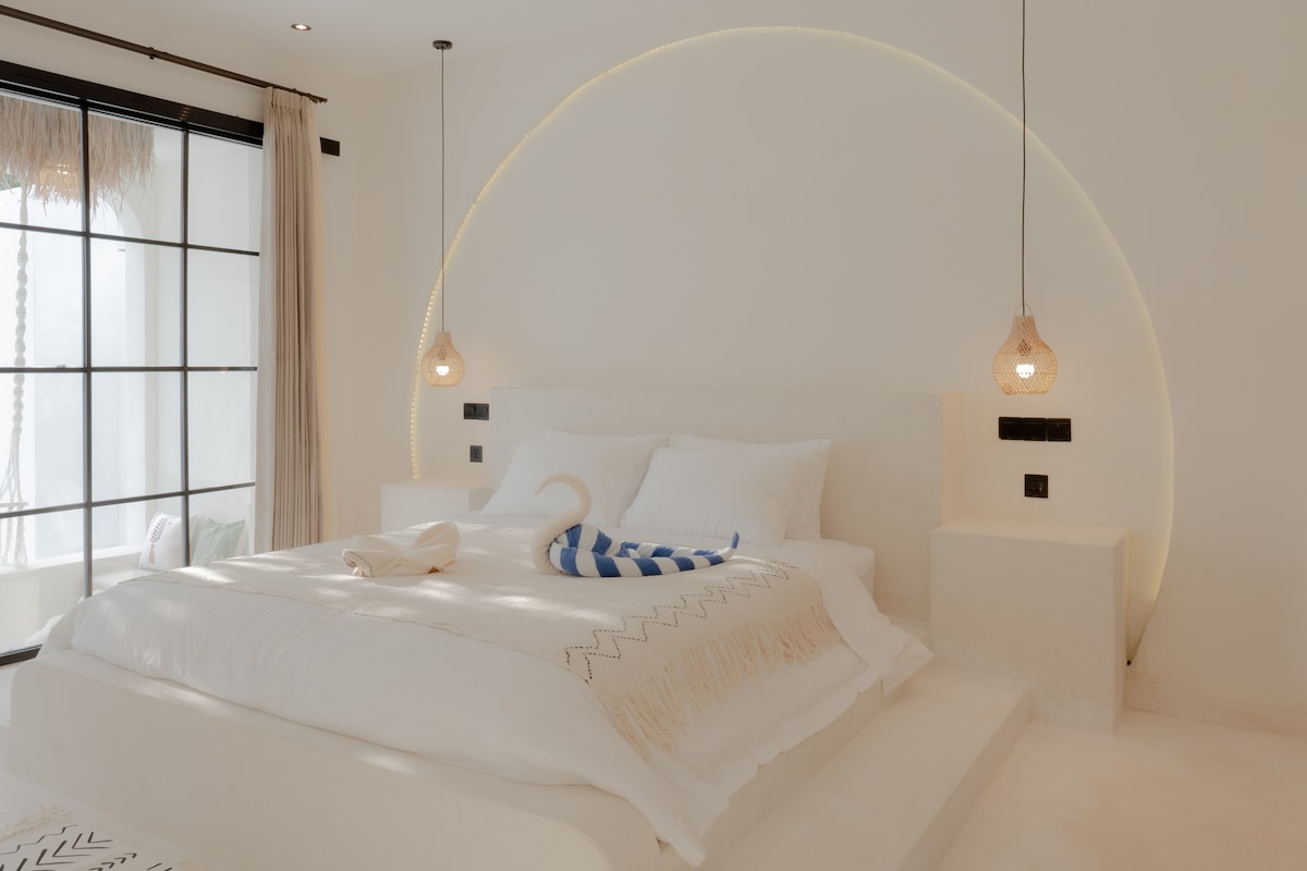 Nuestras cabañas de estilo boho cuentan con un baño interior privado con ducha a ras de suelo, una cama tamaño king y un jardín privado para la máxima relajación. Disfruta de la gran piscina con pufs y tumbonas, y visita nuestro bar para desayunar (incluido) o tomar una bebida refrescante. La decoración es ligera, acogedora y bohemia, con muchos cojines para mayor comodidad.