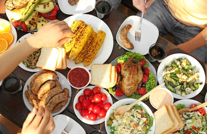 Disfruta de una comida de 4 platos con aperitivo, ensalada y pan, 3 proteínas principales, 3 guarniciones y 1 postre.