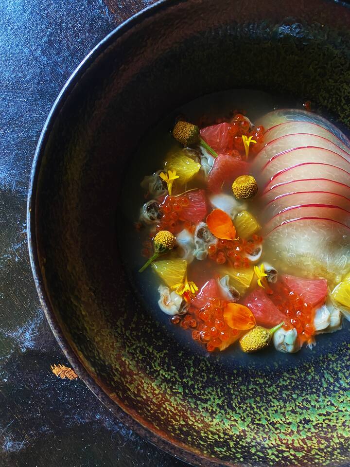 Una degustación en 4 servicios: Desde el aperitivo hasta el postre, una escapada a mi universo de viaje. Sabores reconfortantes con influencias de Japón, Líbano, Congo y Francia
