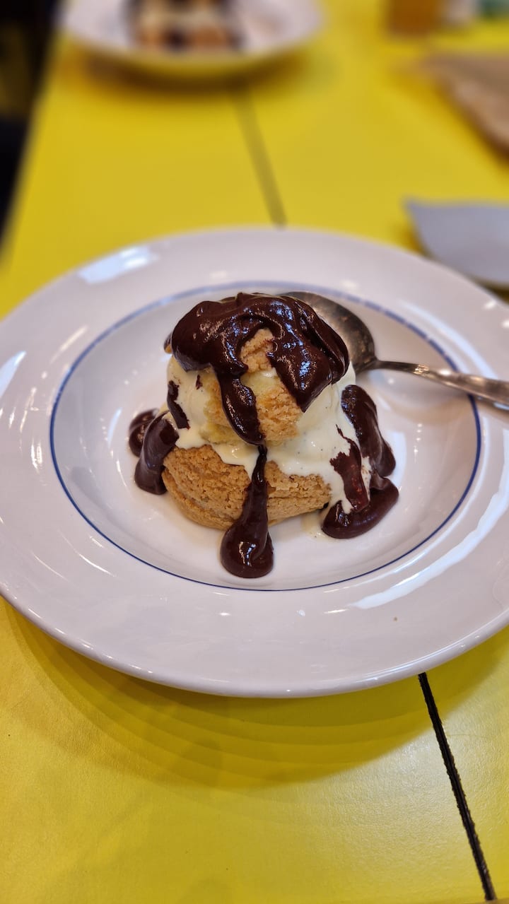 Disfrute de profiteroles preparados en el lugar: choux craquelin fondants adornados con un generoso helado de vainilla, cubiertos con una salsa de chocolate caliente y cremosa, acompañados de chouquettes calientes recién salidas del horno. Aderezo al minuto y pequeño bar de toppings.
