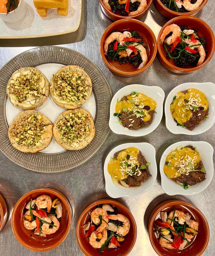 Los menús pueden incluir, por ejemplo, crostini crujientes con ricotta batida y verduras asadas, tartaletas de temporada, pasteles salados y ensaladas/salsas vibrantes servidas con pan. Todo está preparado con la misma atención al detalle que esperarías de una cocina profesional, pero diseñado para que sea fácil de disfrutar.