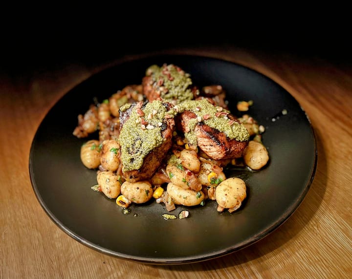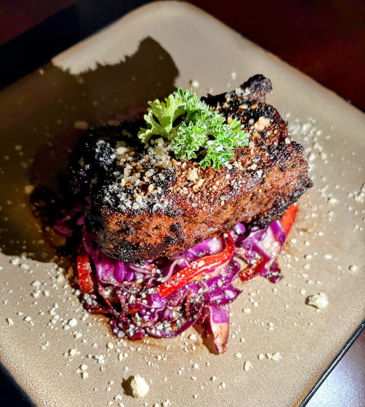Cena gourmet en un asador que incluye una entrada, un plato principal con varias opciones de guarnición y un postre