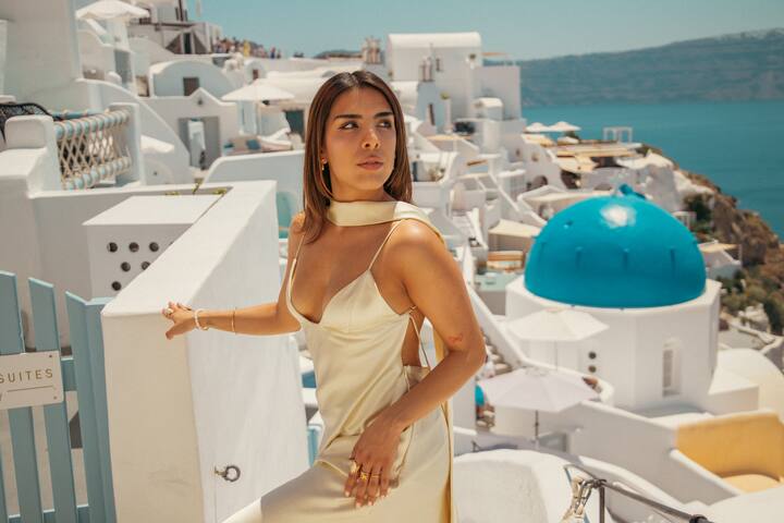 Captura tus recuerdos de Santorini con una sesión fotográfica en el hermoso pueblo de Oia. Disfruta de orientación profesional con los icónicos edificios encalados y las iglesias de cúpulas azules como telón de fondo, con un