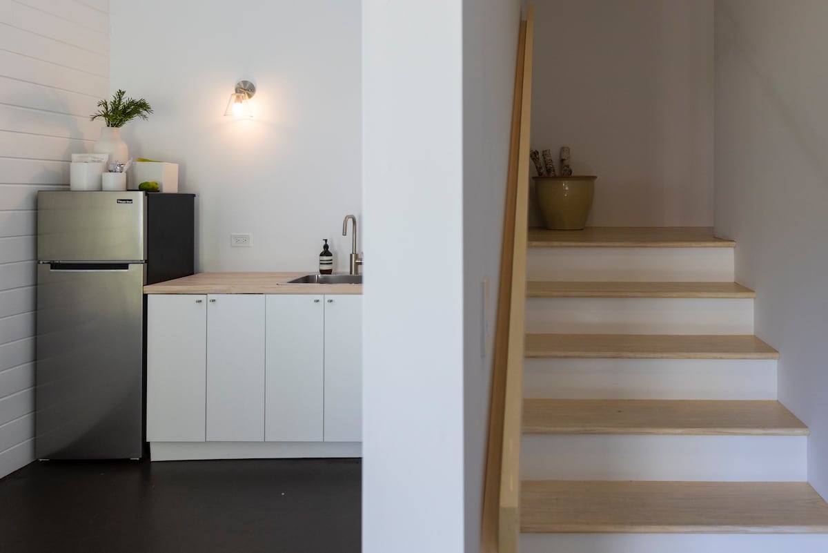 Nuestro acogedor estudio en la planta superior puede alojar hasta 4 personas y está separado de la casa principal. Ofrece tanto comodidad como privacidad. Disfruta de una entrada privada con acceso sin llave para facilitar tu llegada. El espacio incluye una cama Sleep Number tamaño queen, un sofá cama tamaño queen y una mesa de comedor para cuatro personas. La minicocina totalmente equipada cuenta con todo lo necesario para preparar comidas sencillas. Ofrecemos toallas, ropa de cama, almohadas y mantas de lujo para que disfrutes de una estadía cómoda.
