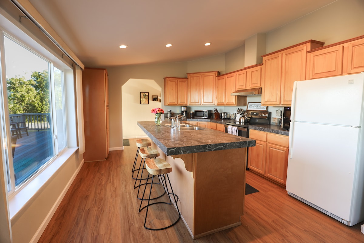 Equipada con dos sistemas de filtración de aire HEPA que funcionan continuamente para filtrar y desinfectar el aire, esta casa es un espacio limpio y seguro para relajarse y disfrutar de la naturaleza. La casa se encuentra en 4 acres en la pintoresca región vinícola de Oregón. La terraza trasera da a un exuberante patio trasero que desciende en cascada hasta un arroyo lento. Contempla la gran ventana de la cocina que da al patio de adoquines, el césped vibrante y bordeado de hermosos jardines maduros, estanque koi y fuente.