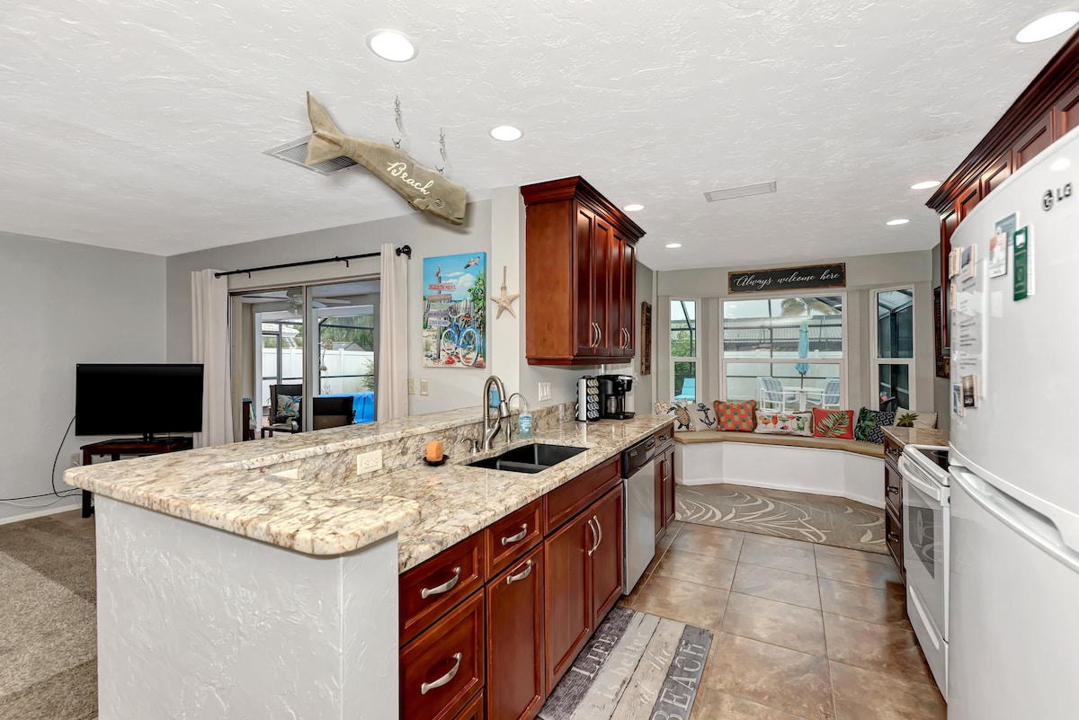 Te damos la bienvenida a Vistalodgings Villa Del Sol, donde las familias se divierten ☀ 3 dormitorios: 1 cama tamaño king, 1 cama tamaño queen, 1 cama doble, 1 cama individual y 2 baños completos Cocina ☀ totalmente equipada: cafetera doble Keurig, máquina para hacer gofres, freidora de aire, hervidor eléctrico, licuadora, batidora, ollas y sartenes. ☀ Comedor para 8 Internet ☀ wifi de alta velocidad Piscina ☀ climatizada gratuita ☀ Cargador para vehículos eléctricos ☀ Mesa de tejo, sala de videojuegos Pac-man ☀ 5 televisores inteligentes con Disney Plus ☀ Bicicletas, sillas de playa, sombrillas, nevera, juguetes de playa ☀ Plancha