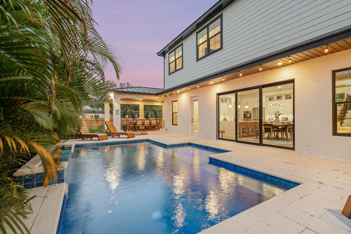 *ACTUALIZADO* ¡Tu familia se sentirá como en casa en este espacioso alojamiento que lo tiene todo! Con un hermoso patio trasero, atractiva piscina CLIMATIZADA, bar tiki tropical, ping pong y otros juegos de césped, habitaciones acogedoras y cómodas, y una cocina equipada con todo lo necesario para preparar comidas para muchos... ¡estarás más que cómodo aquí! La ubicación es súper conveniente, a minutos de Siesta Key, el centro de Sarasota y todas las tiendas de comestibles y restaurantes que puedas desear. Por favor, envíame un mensaje si traes más de 2 mascotas