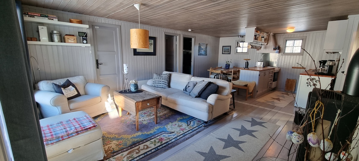Preciosa cabaña ubicada a 20 metros del río. Nueva extensión con agua corriente y calefacción con baño y ducha nuevos, área de entrada con suelo radiante y dormitorio nuevo. La sala de estar y la cocina están renovados. Dentro de la cabaña hay 4 lugares para dormir, cama doble de 150 cm en un dormitorio y dos camas individuales de 75 cm de ancho,en otro. Luego hay un anexo con otros 4 lugares para dormir. En el anexo hay electricidad, pero no agua interior. Trae tus propias sábanas: Es posible que se pueda alquilar por 100 NOK/ 10 euros por persona. Dos lugares de estacionamiento a 10 m de la cabaña.