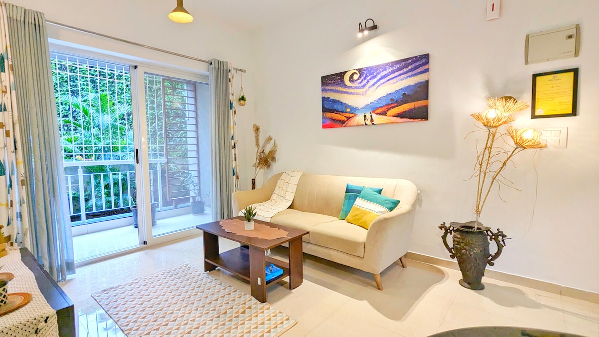 Imagina entrar en un apartamento moderno y cuidadosamente diseñado con exuberantes jardines comestibles en el balcón que compartes con pájaros y ardillas. Ubicado en Siolim Marna, este 1BHK está diseñado para parejas, viajeros solitarios y familias poco convencionales en unas vacaciones cortas, un viaje de trabajo más largo o un retiro tranquilo. Nos encantan todas las cosas de diseño y bricolaje. Cada mueble ha sido reciclado y hemos tratado de pensar en todo lo que puedas necesitar: wifi de respaldo, un bar, una cocina equipada, un columpio, libros y materiales de arte.