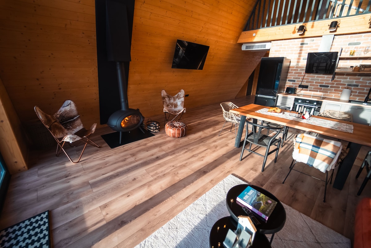 La cabaña tiene una hermosa sala de estar y una cocina totalmente equipada, así como una chimenea. Es extremadamente encantador, el lugar perfecto para disfrutar de la montaña. En el exterior hay un hermoso patio con una terraza al aire libre y una sala de estar para los huéspedes, una barbacoa. Un arroyo encantador atraviesa la propiedad. También hay un parque infantil, 2 hamacas, un columpio y una zona de relajación para adultos: jacuzzi climatizado (que se paga extra a petición). Es el alojamiento perfecto para unas excelentes vacaciones.