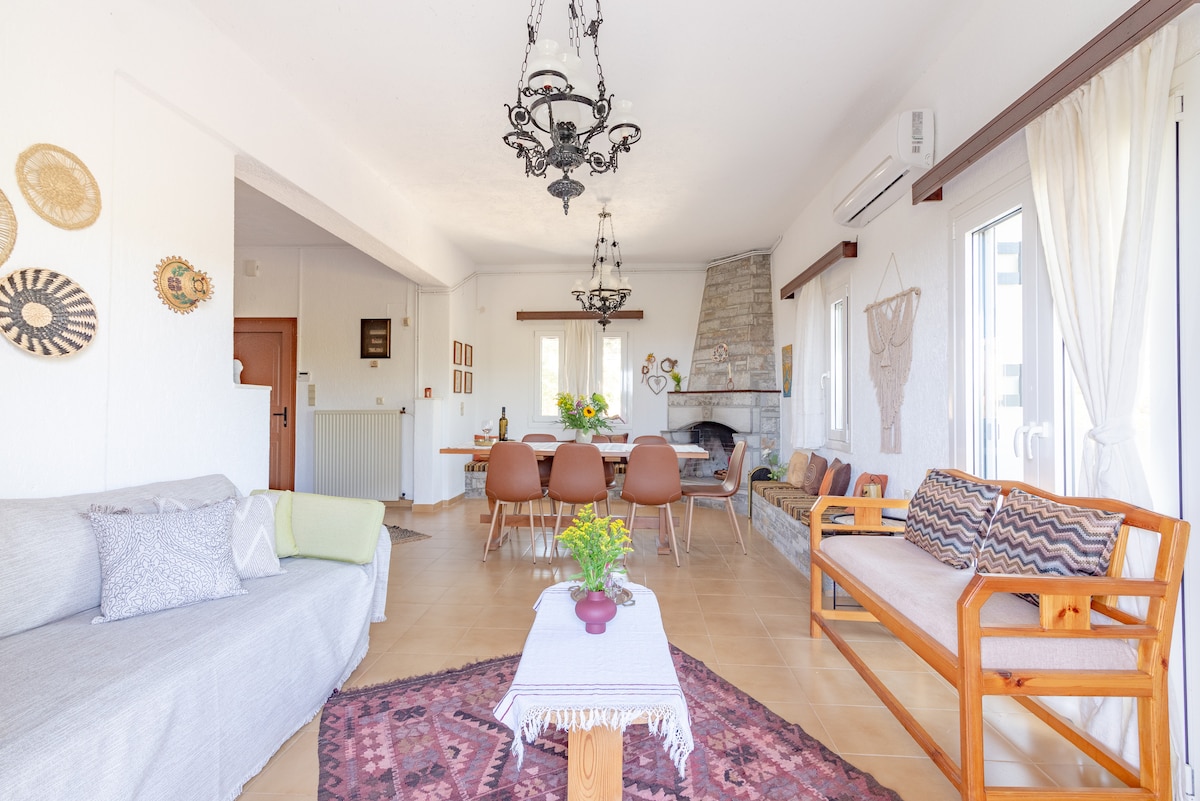 Una casa cretense en un jardín con vistas al mar