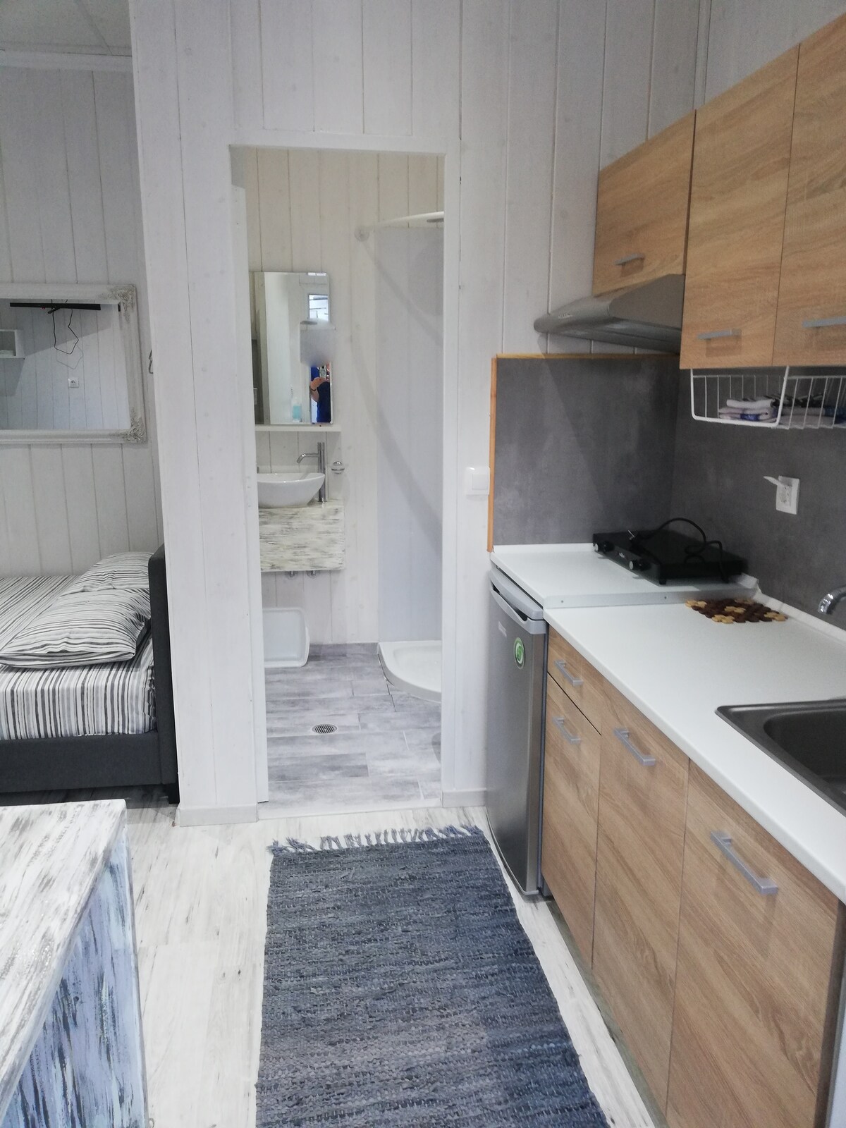 Estudio cuádruple a 150 metros de la playa de Agios Ioannis (playa Sykia) 4 επισκέπτες 1 υπνοδωμάτιο 3 κρεβάτια 1 μπάνιο Lo primero que puedes notar cuando llega a Morfo House es un patio grande y espacioso con un hermoso césped y un árbol de ricas coronas combinadas con un ambiente hermoso y tranquilo que se extiende a través de la finca. La playa más cercana está a solo 150 metros. ¡Consta de un total de dos estudios (unos 20m2) con una cama francesa y una litera!