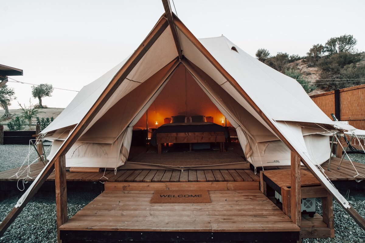 Aura Tent ofrece una estancia tranquila cerca de la naturaleza con total comodidad. La tienda tiene capacidad para 4 personas con una cama doble y un sofá cama doble, electricidad y aire acondicionado/calefacción. A pocos pasos se encuentra tu baño privado al aire libre con ducha caliente. También tienes tu propia parte de la colina con una pérgola, cocina al aire libre, barbacoa de gas y estufa, comedor, además de instalaciones para preparar café y té, con vistas a las verdes colinas. Los huéspedes de Aura Tent disfrutan de acceso exclusivo a una bañera de hidromasaje privada.