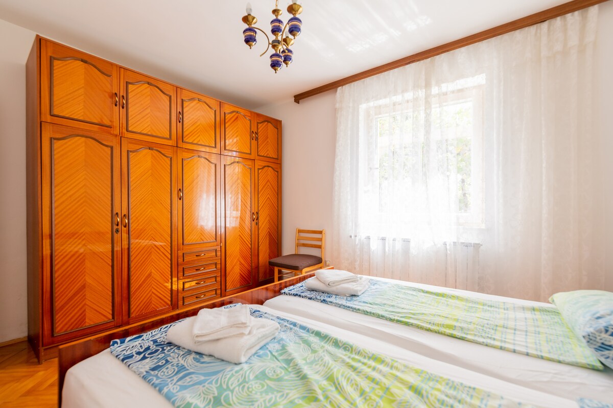 The apartment is located directly by the sea near the old town center. It is located on the first floor and consists of two bedrooms, a kitchen with dining area and a bathroom. Guests have at their disposal a fully equipped kitchen, SAT-TV, air conditioning, WiFi, bed linen and towels. The terrace is shared, but each apartment has a separate corner on it.