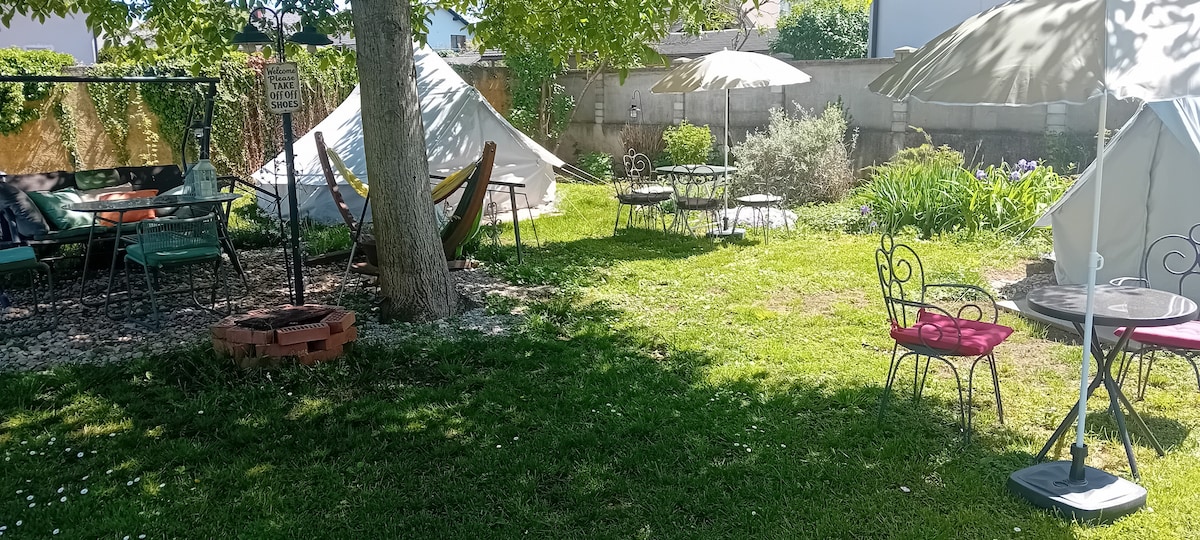 La tienda glamping se encuentra en una pequeña colina junto a nuestra casa apartamento y ofrece una hermosa vista al castillo de Bled y a las montañas. Detrás de la colina, donde se encuentra la tienda, hay un pequeño bosque y la carretera principal con un sendero para caminar y andar en bicicleta hasta el supermercado (200 m) y la garganta de Vintgar (3,5 km). Junto a la tienda hay una pérgola con una cocina abierta y un comedor. El baño privado se encuentra al final de las escaleras de la casa y está a 40 metros de la tienda. Nuestro alojamiento ofrece estacionamiento gratuito.