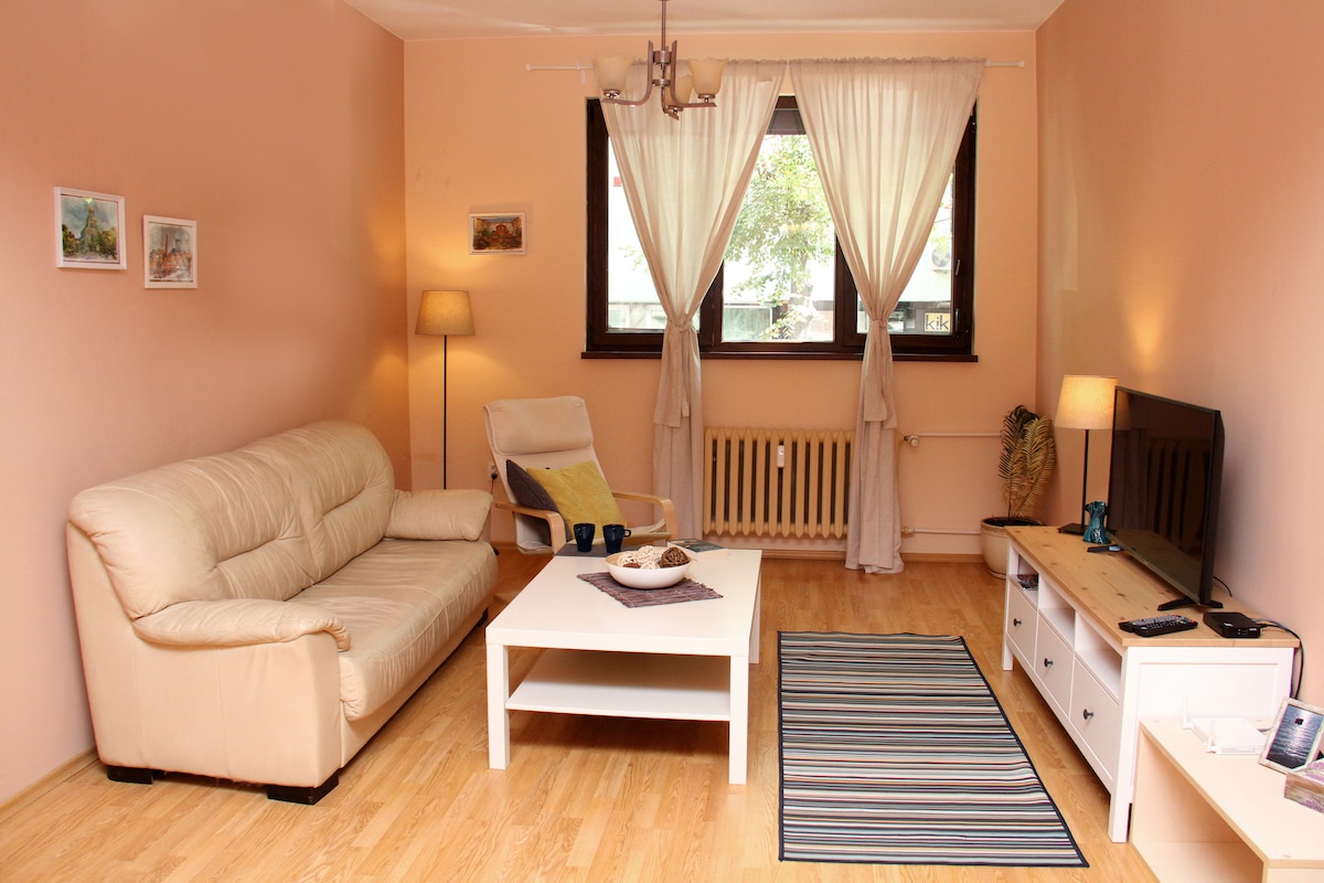 Acogedor y cómodo estudio de 30 metros cuadrados en la planta baja con puerta principal propia. Cerca del centro de la ciudad: a menos de 2 km. Zona céntrica y tranquila. Cama tamaño queen del Reino Unido (160/200), bonito baño pequeño y cocina americana, lavadora. Perfectamente limpio, bien equipado, con atención al detalle. TV / Cable Wifi óptico/50 Mb. Estancia mínima de 2 noches. Llegada y salida autónoma. Nuevo parque y centro deportivo a menos de 2 minutos a pie del estudio. Delante hay un gran centro comercial, Sofia Mall. LIDL a 5 minutos, Kaufland a 10 minutos a pie, centro comercial Sofia a 10 minutos.