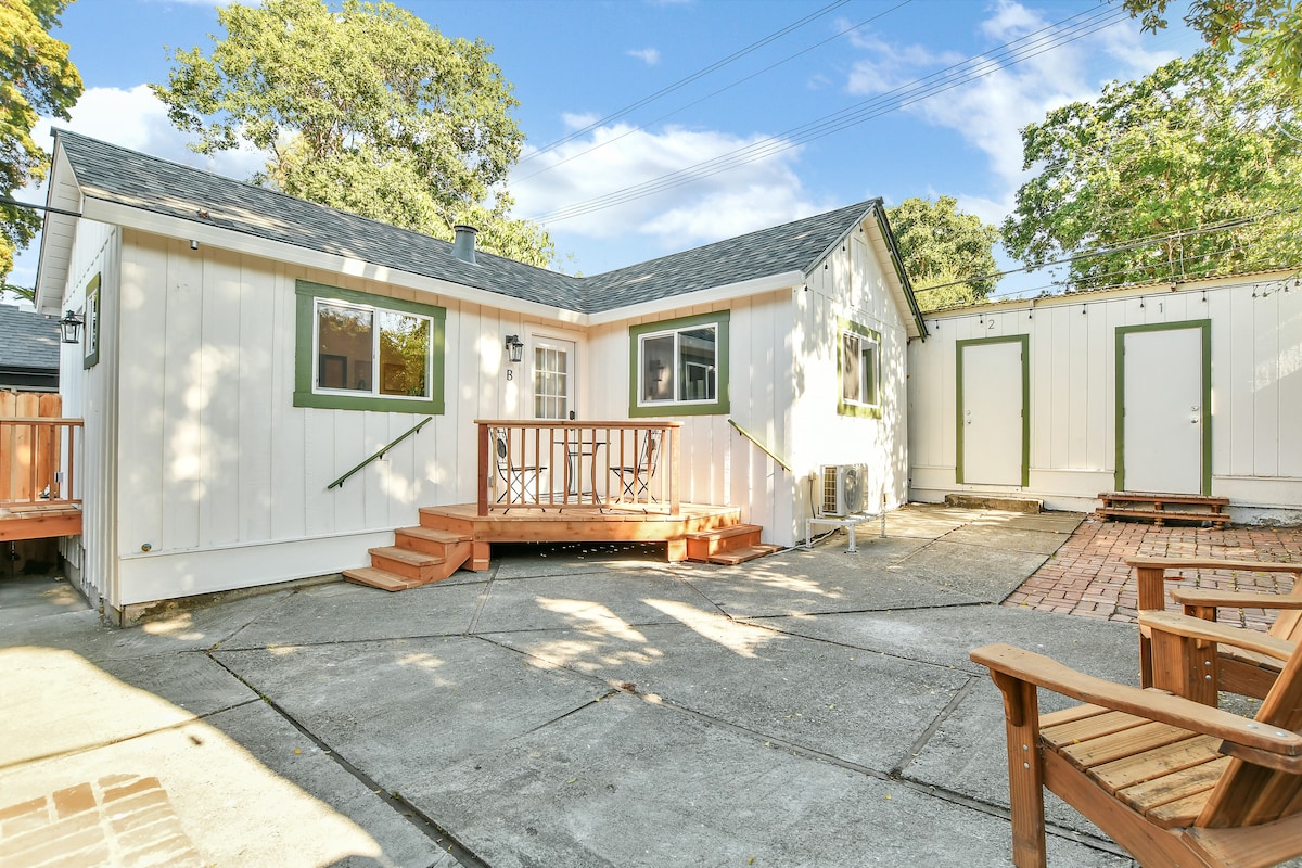 Tiny VaultedHaus es nuevo, terminado en 2021. Situada en el centro histórico de Vacaville, a poca distancia a pie de restaurantes, cafeterías y parques. Elegante y moderna. Una gran pasarela cubierta te separa de la casa principal, sin paredes compartidas, entrada privada con código de puerta. Se prestó atención a los detalles para garantizar a nuestros huéspedes una estancia cómoda y elegante. Cómoda cama tamaño queen, artículos de aseo, cocina abastecida y patio privado. Napa, San Francisco, Sacramento y Winters están al alcance de tu mano. Se admiten perros con permiso y por una tarifa de 65 USD.