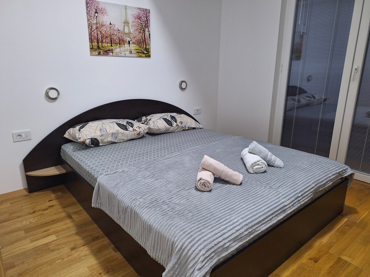 Disfruta de una experiencia de lujo en este céntrico alojamiento. Este es un apartamento NUEVO de 60 m2 a 5 minutos a pie del parque de la ciudad (estadio) y de la plaza principal. La mejor ubicación posible, muy cerca de las encantadoras calles de Debar Maalo con muchos bares y restaurantes. El apartamento tiene 1 dormitorio con cama tamaño queen y una sala de estar con un cómodo sofá cama + cama extraíble. También hay 2 balcones en ambas habitaciones, uno con vistas a la montaña Vodno. Puedes utilizarlo para tomar un café o almorzar.