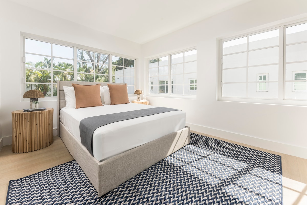 ¡Alójate en South of Fifth, el barrio más encantador de Miami Beach, a solo una cuadra de la playa! Esta acogedora unidad cuenta con una cama tamaño king, TV inteligente, Wi-Fi, aire acondicionado, espacio de trabajo, nevera, plancha, secador de pelo y ropa de cama de primera calidad. Disfruta de servicio a la habitación, café en el vestíbulo, entrega de equipaje, cuna a pedido y comedor al aire libre. Perfecto para relajarse después de un día al sol. Camina a los mejores restaurantes, parques y el océano en minutos. A petición, se proporciona estacionamiento a dos cuadras del hotel en un garaje cerrado por $20/día.