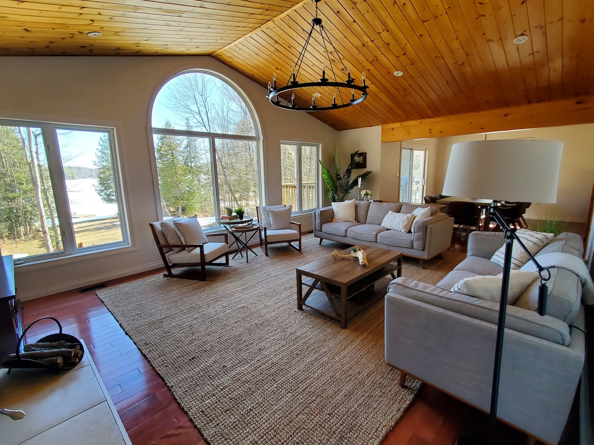 Un refugio privado junto al lago con sol y puestas de sol durante todo el día, con la cabaña principal, sauna de madera, kayaks y bote de remos, costa privada y muelles. Wifi ilimitado, una cocina totalmente equipada, dos fogatas, muelles, excelente natación (limpio y libre de malezas) en una propiedad boscosa privada. Está a 15 minutos de Haliburton con muchas tiendas. La ropa de cama y las toallas tienen un coste adicional de 30,00 por cama. Por favor, consulta. Los fines de semana largos son de 3 días/noches como mínimo.