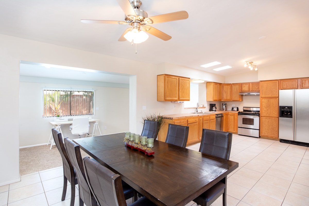 Casa a estrenar ubicada cerca del centro de la ciudad. A minutos de todos los espectáculos Gem y de los campos de fútbol Kino. Hay muchos restaurantes y bares cerca. También hay un Costco, Walmart y una sala de cine cerca. Oficina de correos abierta las 24 horas a la vuelta de la esquina. Esta casa está a pocos minutos de la Universidad de Arizona y a 15 minutos del aeropuerto. Ubicación muy práctica. Aparcamiento en las instalaciones. Espacio abierto de 600 pies cuadrados con dos camas tamaño queen. Cocina, baño y ducha. El patio está cerrado para que puedas tener mascotas solo fuera, NO dentro.