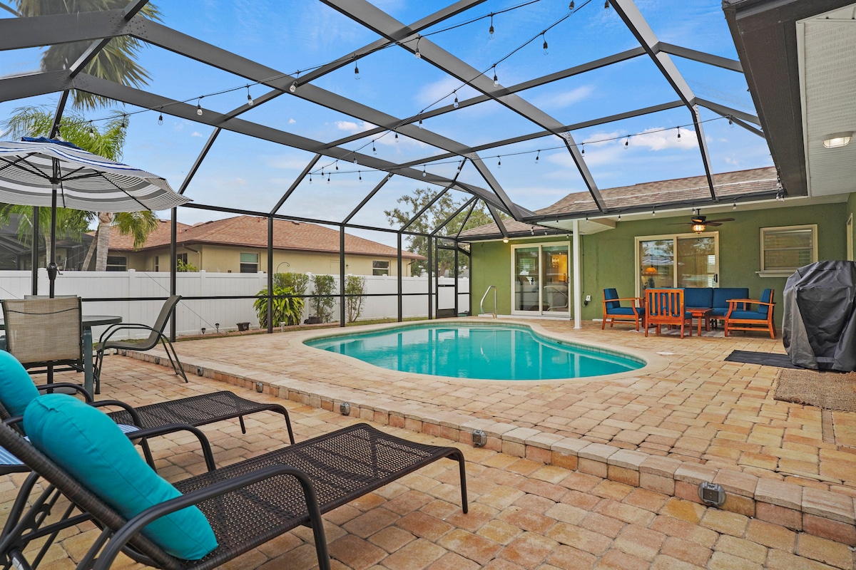 Nuestra hermosa casa de vacaciones con piscina está a solo 200 yardas de Shamrock Park, con sus muchos senderos para caminar y andar en bicicleta a lo largo de la vía fluvial, a diez minutos de 4 playas diferentes, a solo 4 minutos en coche de una playa privada y a 10 minutos de la playa para perros de Brohard. Nuestro patio trasero privado envuelve nuestra piscina/lanai. El barrio es tranquilo y seguro, con vecinos amigables. Tenemos 2 dormitorios de tamaño completo, así como un rincón más pequeño fuera del garaje que incluye una cama de tamaño completo.