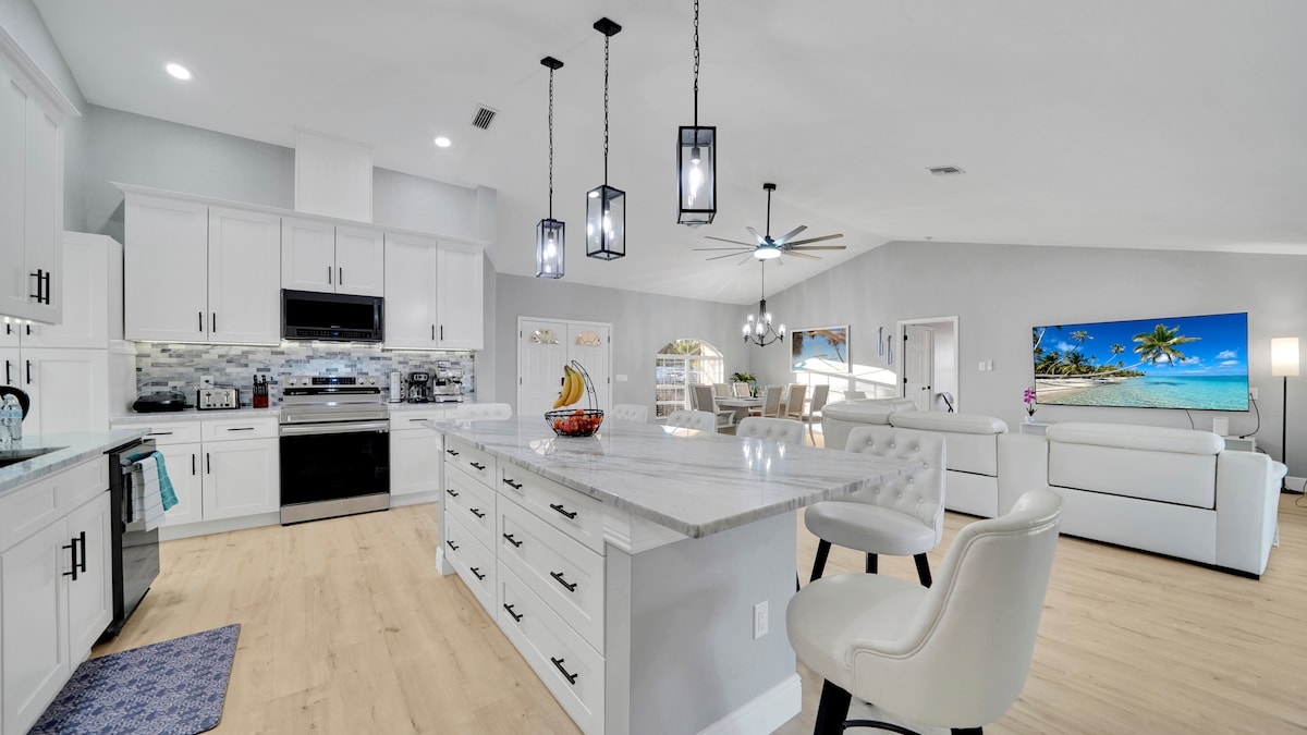 Escápate a la tranquilidad en esta impresionante casa de playa, rodeada de exuberantes jardines tropicales. Sumérgete en la piscina, cómodamente encerrada dentro de una jaula protectora, o disfruta de pizzas caseras en el horno de pizza de lujo. Relájate con una bebida refrescante en el bar lanai o disfruta de una siesta tranquila en una de las acogedoras camas o en el sofá cama. La cocina abastecida tiene todo lo que necesitas para tus aventuras culinarias. Lo mejor de todo es que estás a poca distancia en coche de varias playas impresionantes de la Costa del Golfo.