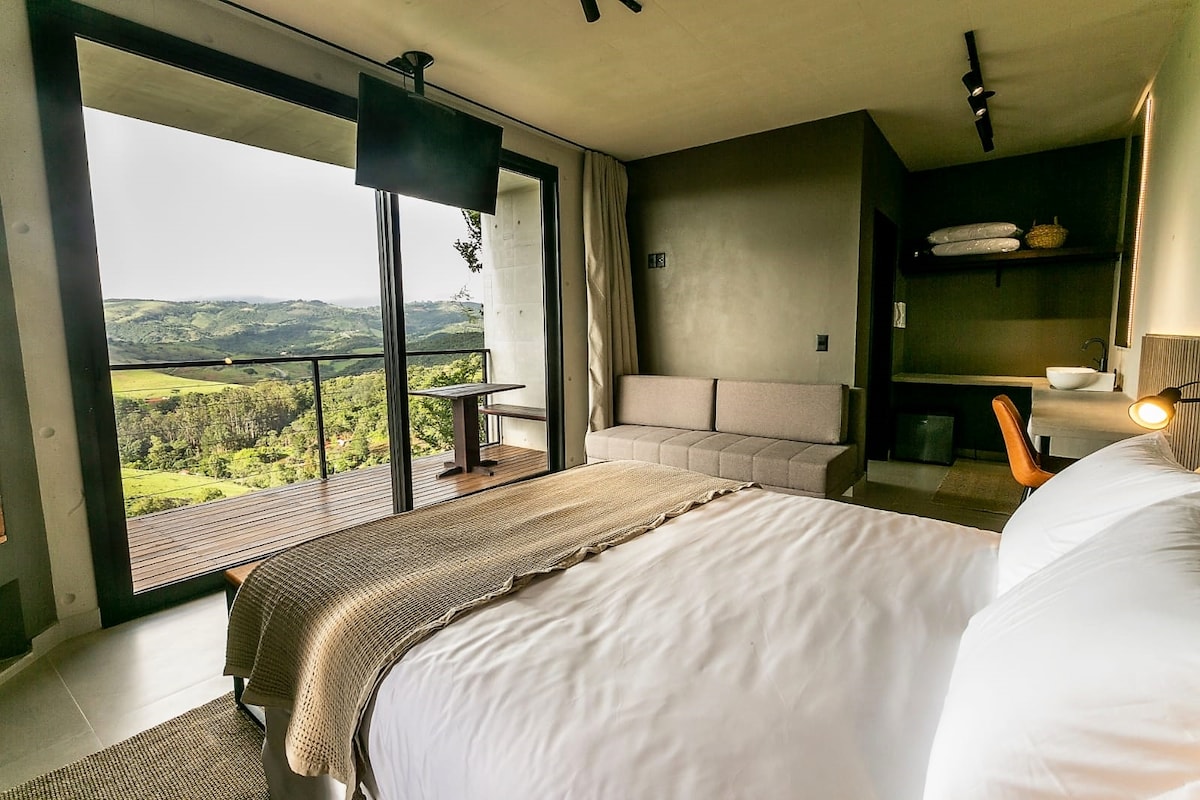Mushrooms es una cabaña exclusiva para parejas. En las copas de los árboles, construimos una cabaña diferenciada, con comodidad, practicidad y una vista increíble de Serra da Mantiqueira. Equipado con cama queen, Wi-Fi con fibra óptica, Smart TV, chimenea, calefactores y mini cocina (cocina eléctrica de 2 hornillas, microondas, minibar y utensilios). DESTACADO para hidro con vista panorámica a Serra da Mantiqueira.