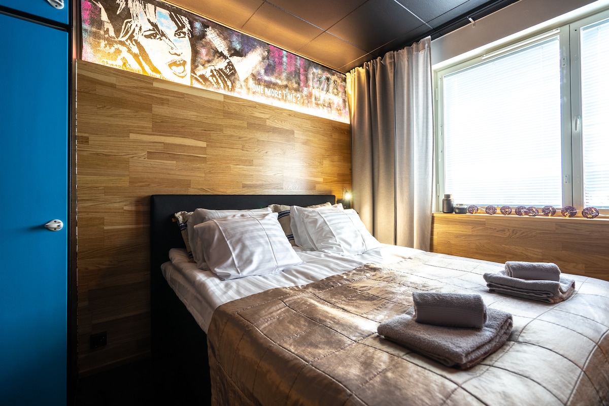 Una mini habitación es una excelente opción para una o dos personas. La mini habitación (6 m²), diseñada con una moderna solución compacta, tiene una cama de alta calidad de 140 cm de ancho. Las habitaciones cuentan con aire acondicionado, TV de pantalla plana, nevera y utensilios. Puedes cocinar tu propia comida en acogedoras áreas comunes de cocina, disponibles en todos los pisos. El hostal tiene baños comunes limpios, duchas, sauna y lavanderías. El precio incluye wifi, ropa de cama, toallas y limpieza final. El nuevo sistema de cerradura con código facilita la llegada.