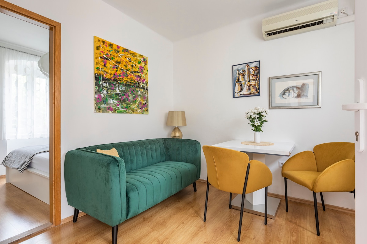 Disfruta de impresionantes vistas al mar desde tu balcón privado en este alojamiento lleno de arte en Split. Perfecto para 2, este luminoso departamento ofrece un espacio de trabajo dedicado, wifi rápido y un raro espacio de estacionamiento privado. A pocos minutos a pie del Palacio de Diocleciano, las playas y el puerto de ferry, es la base ideal para explorar la ciudad. Disfruta de lo mejor de Split con tranquilidad y acceso central.