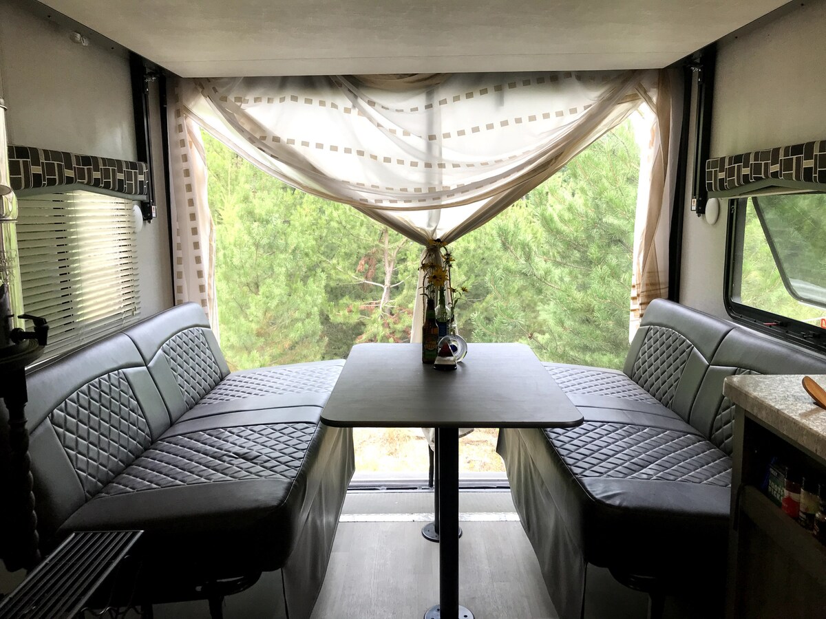 Este es un nuevo remolque de viaje ubicado en una propiedad residencial privada. La unidad tiene una cama tamaño king en el dormitorio trasero y un sofá que se convierte en una cama de tamaño completo. La mesa del comedor también se puede convertir en una cama de tamaño completo. Hay una ducha de gran tamaño en el baño y también una ducha ubicada en el exterior para lavarse. Hay una mesa grande y sillas afuera bajo un dosel para su uso. Una gran parrilla con propano se encuentra junto al dosel y está limpia y lista para su uso. Los utensilios de barbacoa están disponibles.