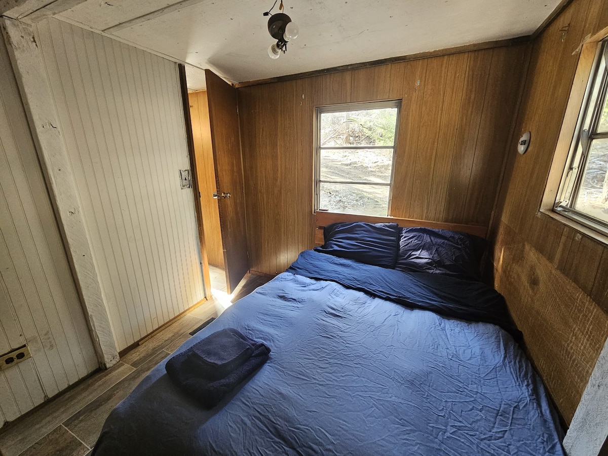 Muy tranquilo, decoración única, loft para dormir, cocina completa. WC y ducha en otro edificio. También hay un retrete exterior. Patio privado en la parte trasera. 3 lagos cercanos para pescar y nadar. Por favor, trae zapatillas, no se permiten zapatos de exterior dentro. No hay agua corriente en la cabaña, sin embargo, tienes acceso a agua en la parte trasera donde puedes lavar los platos, etc. cuando el clima lo permita. Solo adultos, por favor, no es seguro para niños.