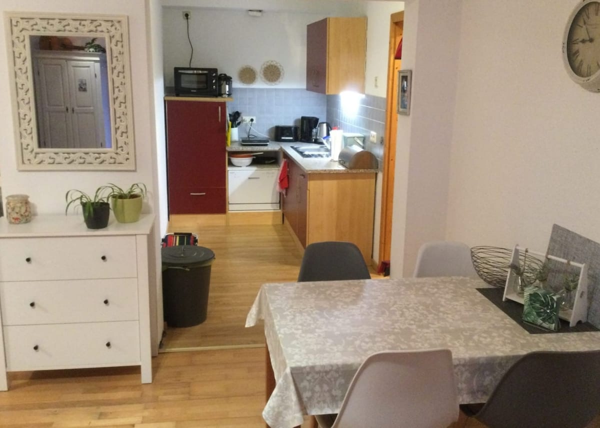 Nuestro apartamento granero con grandes camas de la época de la bisabuela está equipado con una acogedora sala de estar, 2 televisores y wifi. En el dormitorio pueden pernoctar 3 personas, además de 4 huéspedes en la sala de estar. (Cama doble de 2x2 m y sofá cama de 120x200 cm). La cocina invita a cocinar. El baño tiene ducha, inodoro y lavabo. El apartamento tiene su propia entrada. Se vive solo muy tranquilo en el granero justo al lado del jardín. Nuestro Wallbox en el patio proporciona la mayor comodidad para recargar el coche eléctrico.