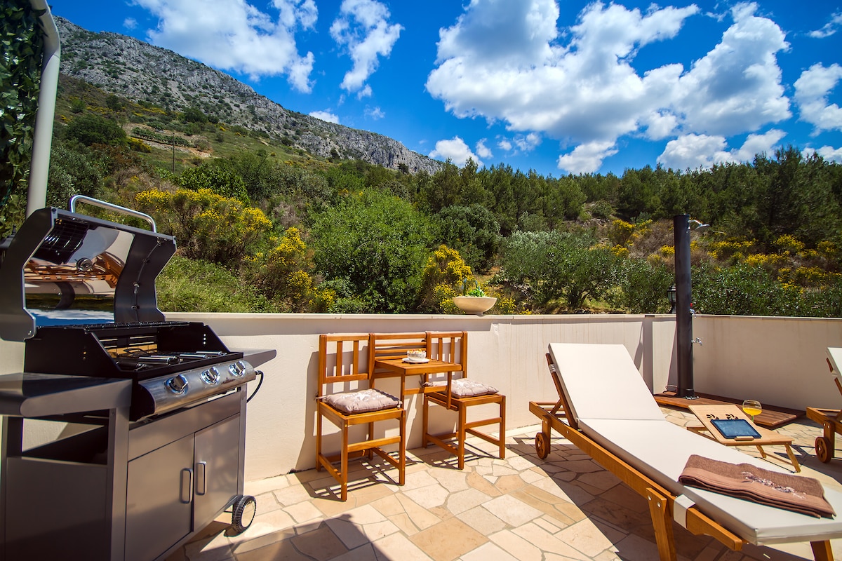 Este hermoso apartamento con capacidad para 5 personas es la puerta de entrada perfecta para tus vacaciones. El apartamento está situado en el último piso de la casa con vistas increíbles al mar y un acogedor balcón con una mesa y 6 sillas. Dos habitaciones con camas dobles y un lugar adicional para dormir en la sala de estar serán suficientes para un máximo de 5 personas. Lo que es extra es la increíble piscina junto a la casa, exclusivamente para tu uso ilimitado (privado), donde podrás disfrutar de las mejores vistas al mar directamente desde la piscina infinita.