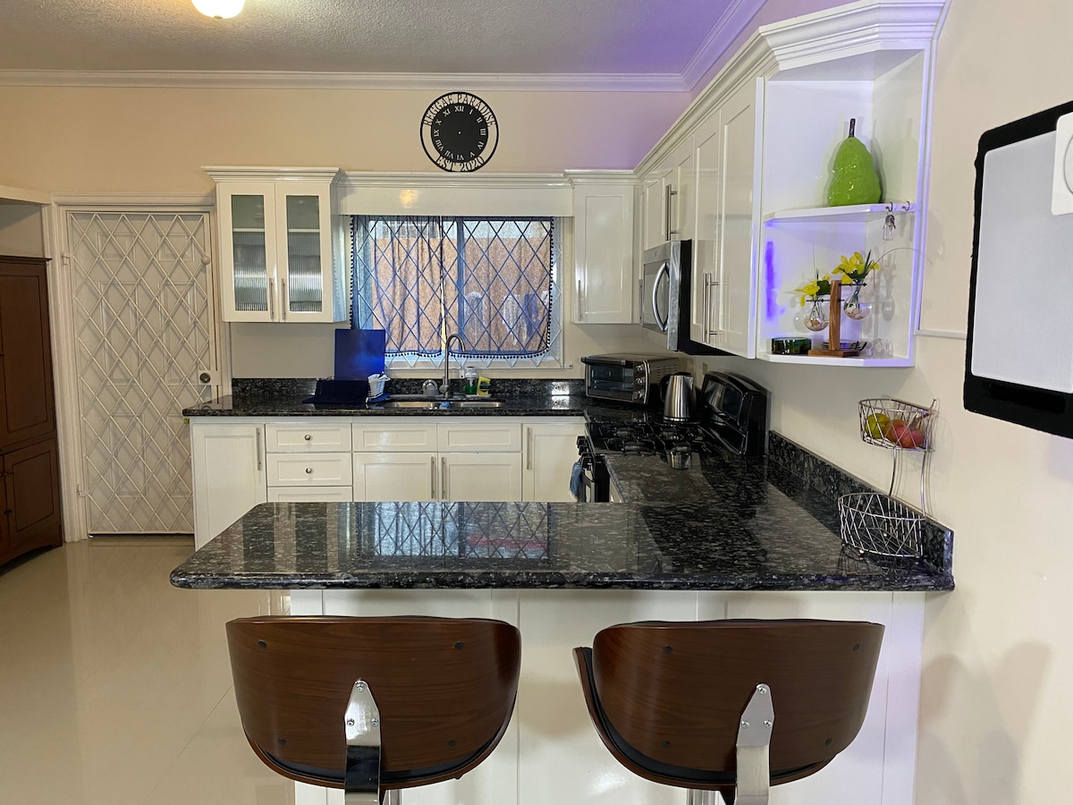 Alojamiento de lujo moderno con ubicación céntrica y concepto abierto, con decoración moderna. 8 camas| 2,5 baños, sala de estar, comedor, cocina bien equipada, piscina reluciente con glorieta, juegos, mesa de billar. Amplio dormitorio principal con mesitas de noche y cómoda, además de un baño privado tipo spa. Gran patio cerrado. Segundo dormitorio con cama tamaño queen, sofá cama con ruedas, TV, mesita de noche, tercer dormitorio con cama doble y litera, mesita de noche y vestidor. Segundo baño con ducha de lluvia. A 5 minutos de Pearly Beach, Laughing Waters, Dunn's River Falls, Mystic Mountain, Dolphin Cove, 1212L