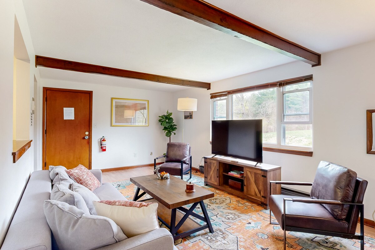 Acogedor estudio ubicado en 90 acres de propiedad privada que incluye bosques y campos de conservación, perfecto para una caminata desafiante y la observación de la vida silvestre. El apartamento tiene 1 cama tamaño queen con cuna desplegable y un baño completo con ducha y una selección de toallas. La cocina totalmente equipada viene con nevera, microondas y la lavadora y secadora de la planta baja significan menos equipaje. Cuando no estés explorando el campo, hay wifi y un televisor inteligente para que te entretengas.