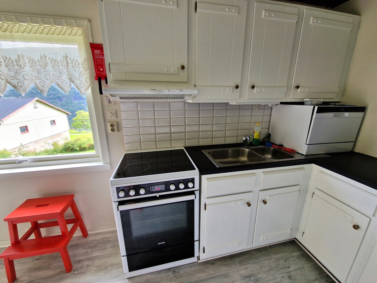 Joya escondida en las montañas y fiordos de Noruega, piso tranquilo para descansar o viajar al cercano sitio del patrimonio mundial de la UNESCO de Geiranger, también Trollstigen, Stranda Ski Center y la belleza natural de Sunnmøre. Cada temporada es impresionante. Esquí en invierno, tiene un quemador de leña/choc caliente. Primavera/verano, camina por las montañas o camina 5 minutos a través del bosque hasta el fiordo y la pesca. Relájate en el apartamento, vuelve a concentrarte y vuelve a energizarte mientras disfrutas de la paz. 1-2 personas, se proporciona una cuna pequeña para niños.