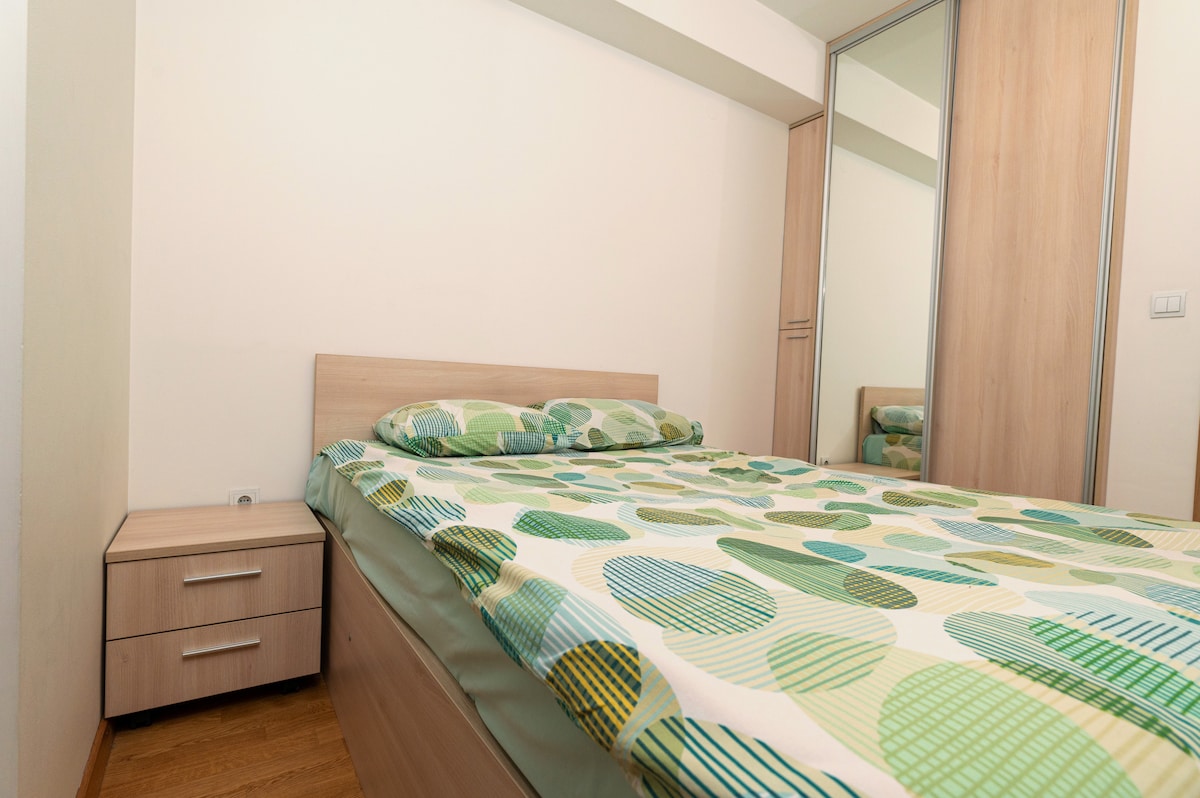 Apartamento nuevo y moderno ubicado en el centro de la ciudad de Skopje. Tiene capacidad para 3 personas. Hay un sofá en la sala de estar (1 persona) y dos camas separadas en el dormitorio. Hay una cocina totalmente equipada, baño, dormitorio, sala de estar y balcón. La estación internacional de autobuses y la estación de tren están a poca distancia. La plaza Macedonia y el antiguo bazar están a pocos pasos, a 15 minutos. El centro comercial East Gate y Vero Mall están a pocos minutos a pie. ¡Disfruta de tu estadía!