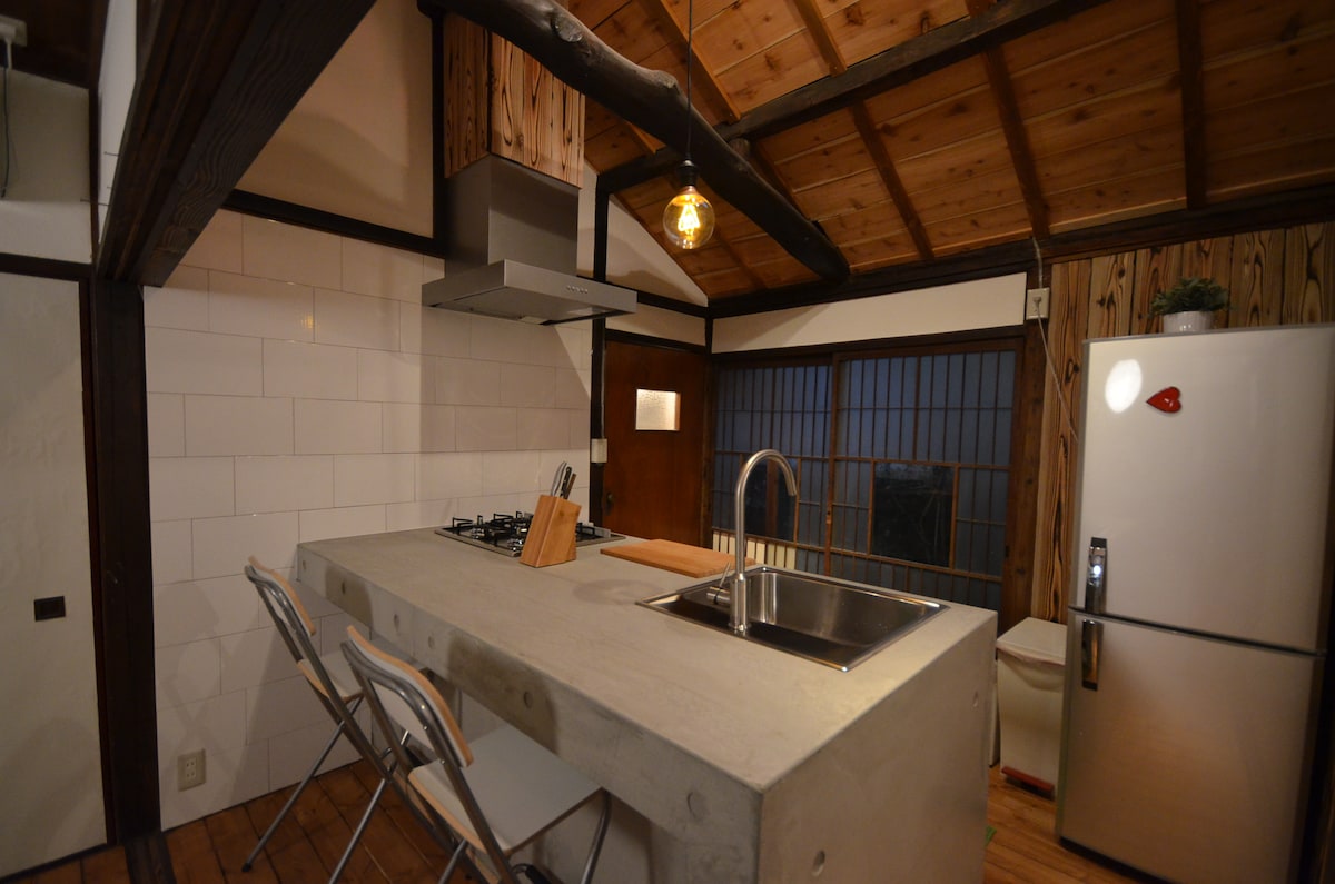 La casa es un edificio remodelado conjuntamente por un conocido arquitecto japonés y el propietario. La casa tiene 4 habitaciones, 2 、baños compartidos. Todas las habitaciones son de estilo tatami japonés. Esta habitación da al jardín japonés. La colección personal del propietario de pinturas, caligrafía, porcelana, tallas de madera y otras obras de arte se puede ver en todas partes de la casa. Hay una cocina compartida, un salón y un patio al aire libre. Los huéspedes pueden comer, charlar o tomar el té con el anfitrión.