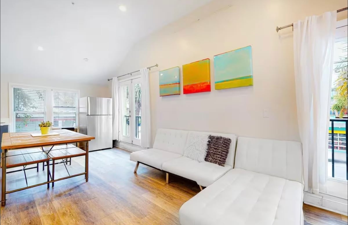 ¡Apartamento de un dormitorio en la playa más cercana de Charleston! A 15 minutos del centro de Charleston y a 500 pasos del océano. La ciudad de Folly Beach tiene muchos restaurantes aptos para mascotas, un parque para perros y se admiten perros en la playa de octubre a abril. Hay una cama tamaño king de lujo en el dormitorio principal, así como un sofá cama tamaño queen y dos sillas decorativas en la sala de estar. Hay un televisor inteligente de 50 pulgadas en la sala de estar. Cocina pequeña con lavavajillas. Acceso a lavadora/secadora en la suite (compartida con un vecino).