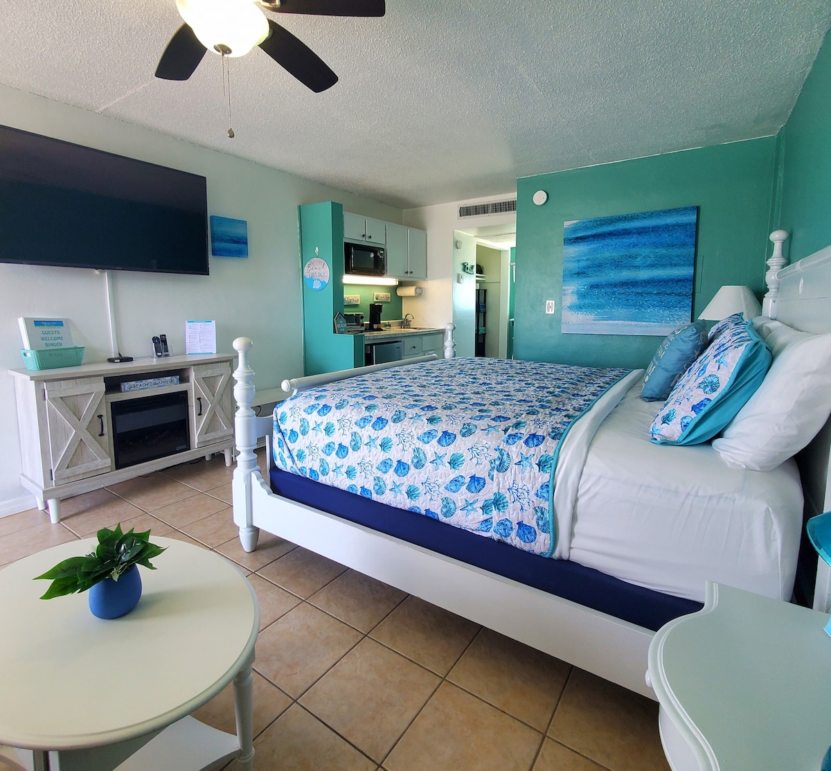 Despiértate con vistas directas al mar y a la piscina en este estudio tamaño king actualizado en la planta baja del Daytona Inn. Relájate en tu balcón privado de tamaño completo con asientos y una silla columpio con vistas a la piscina frente a la playa y la costa atlántica. Cocina pequeña con mininevera y microondas incluidos. Acceso directo a la playa en la tranquila sección sin conducción. Se proporciona un espacio de estacionamiento gratuito gratuito. Reserva ahora y disfruta de una verdadera vida frente a la playa.