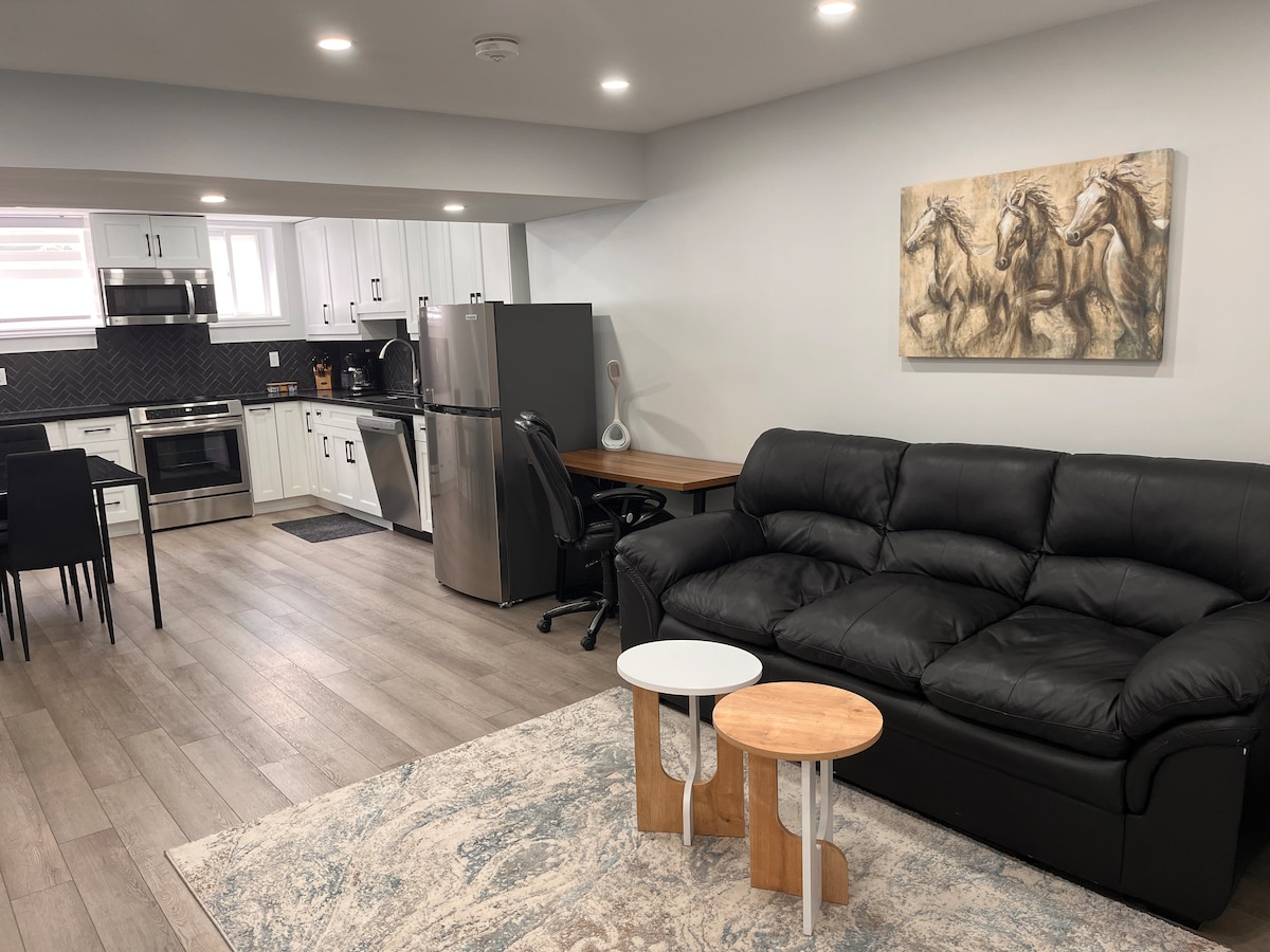 Experience modern comfort in our newly built Airbnb. This spacious three-bedroom basement features 3 comfortable beds and a sofa bed, with an en-suite bathroom in each bedroom. Enjoy a fully equipped kitchen, in-unit washer and dryer, free parking on the driveway, a stylish living room, high-speed Wi-Fi, and Smart TVs with free access to Netflix, YouTube Prime, and Amazon Prime TV. Our place has a private entrance and is located in a modern, quiet, and peaceful neighborhood.