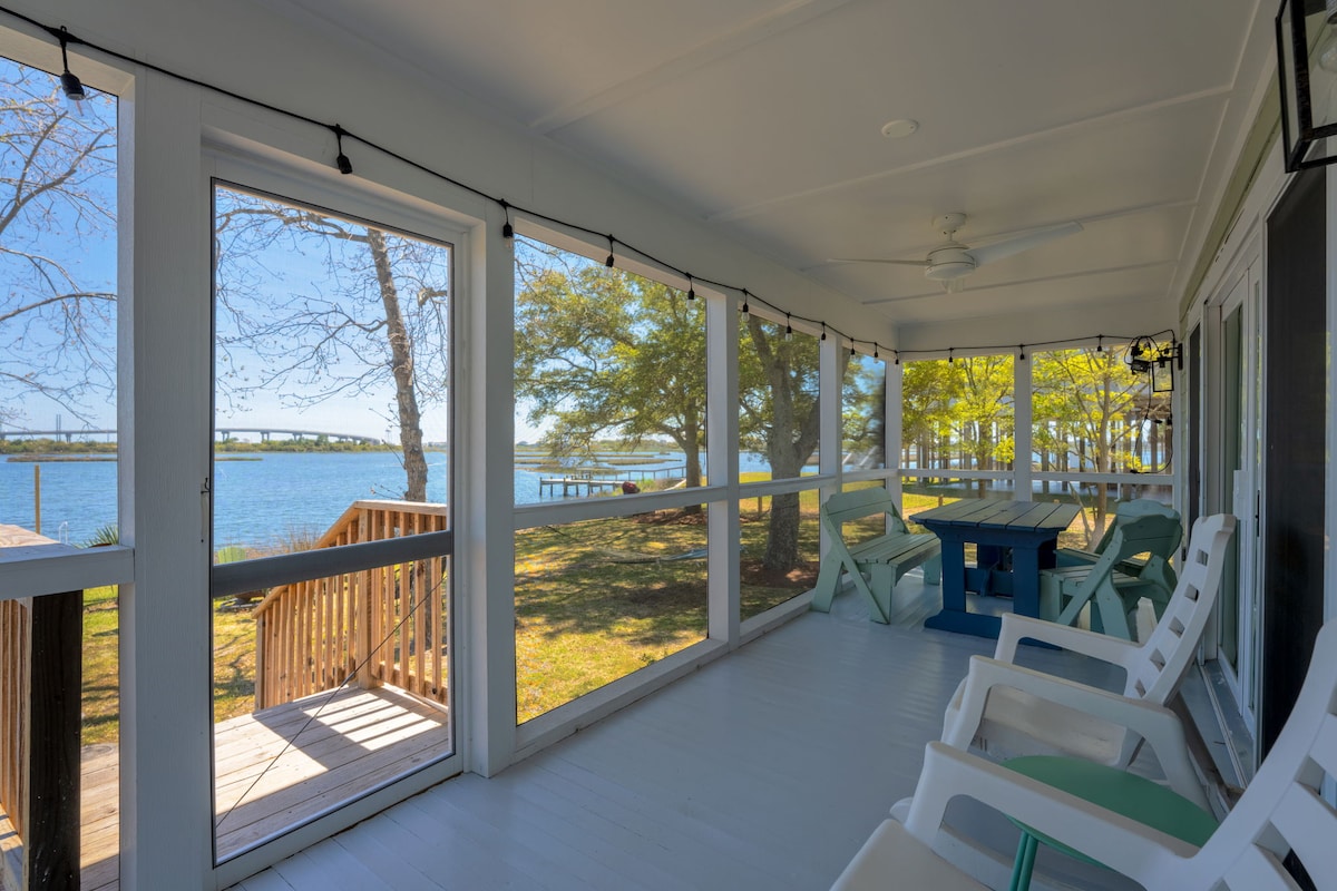Waterfront cottage, fully renovated, with stunning views of Topsail Island and Surf City bridge, and a private dock! Just minutes from the beach, this 3BR, 2BA home offers a peaceful retreat. Newly Custom-renovated with high-end finishes, it features an open layout, modern appliances, and a spacious screened porch for dining or lounging. Fish, crab, or kayak right from the property (kayaks provided; and private dock). Enjoy WiFi, Roku TVs, and plenty of parking. *Pets require pet fee* No Cats!