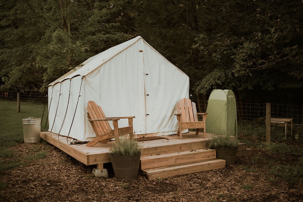 Ubicado en el bosque, The Porch es un refugio tranquilo y privado, una acogedora tienda de lona con dos porches y una ducha al aire libre bajo los árboles. Ubicado en 5 acres compartidos con una granja familiar, está rodeado de flores silvestres, jardines y un puesto de granja junto a la carretera en el frente. Disfruta de complementos opcionales como recorridos por la granja, cestas de cosecha para recoger y sesiones de fotos. Las noches brillan bajo las luces de una fogata y los juegos. Con vistas al río Susquehanna, acceso a canoa/kayak a solo un par de minutos.